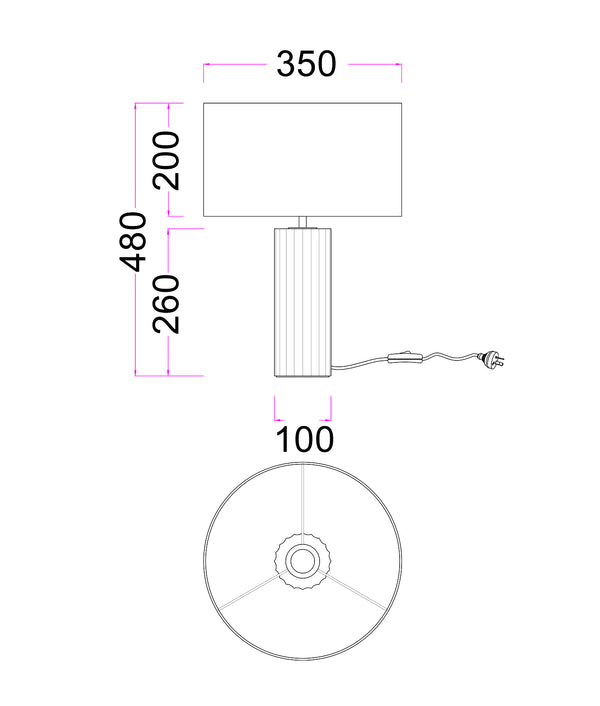 Material: Shade: fabric; Base: Travertine; Highlight: Iron